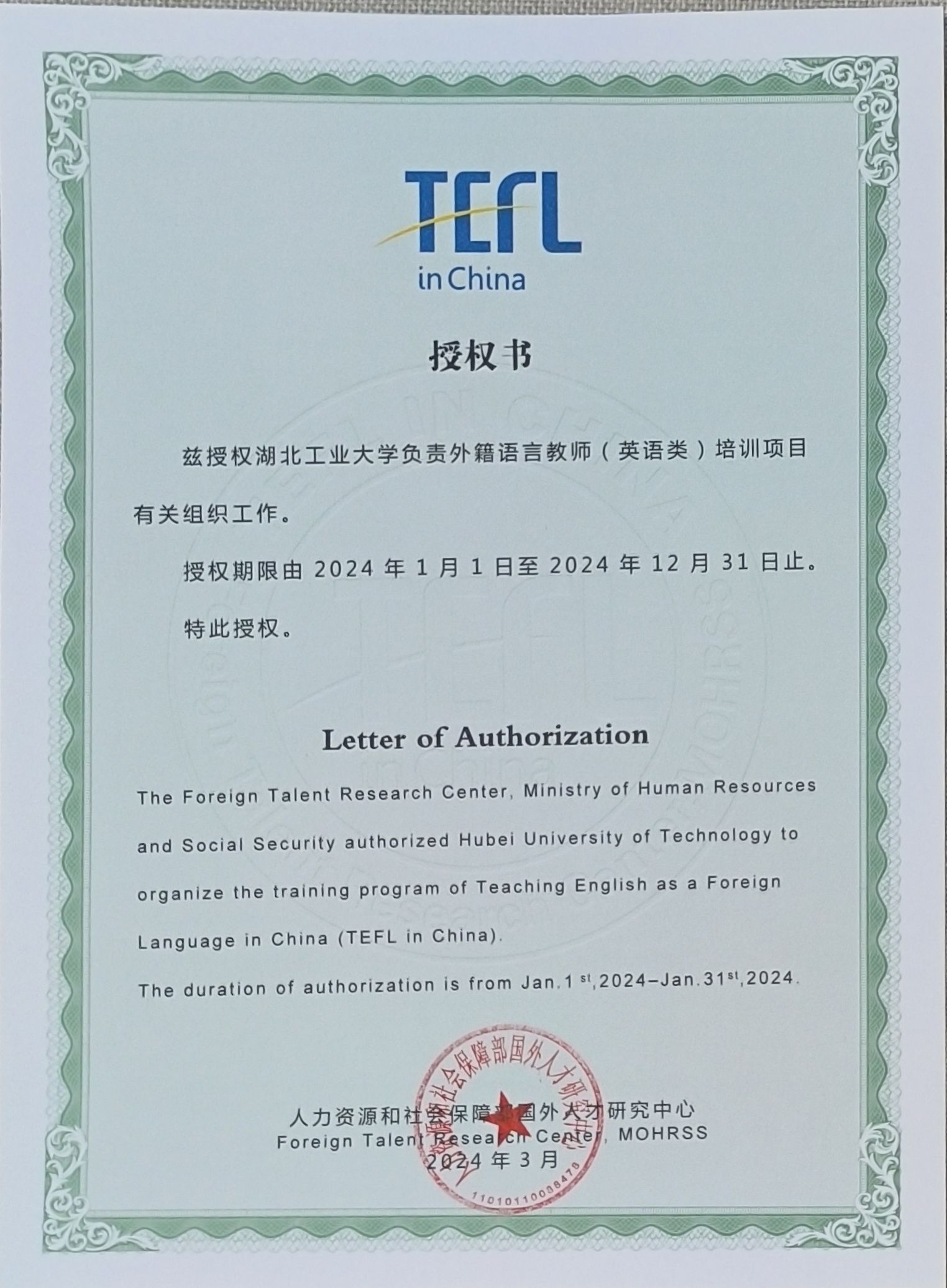 The TEFL in China training program is sponsored by the Foreign Talent Research Center, Ministry of Human Resources and Social Security (MOHRSS). The TEFL in China certification is officially recognized throughout China.
