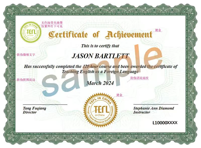 TEFL in China Online is an online 120-hour EFL course developed in 2020.Each unit (except for Unit 19) has a short unit quiz that must be taken before you can move on to the next unit. A final exam will be taken upon completion of all the units.