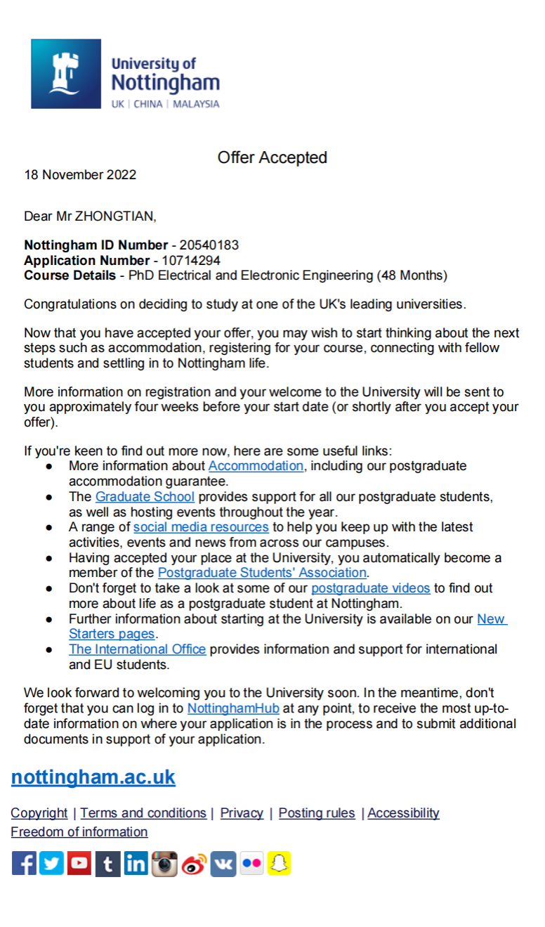 (Qinghua Lv, report) Relying on National“111 Research Center” ,Microelectronics and Integrated Circuits and supported by the National Institute of Modern Industry (School of Chip Industry), the School of Science has been successfully approved as the International Cooperative Training Project of "Microelectronics and Integrated Circuit" Innovative Talents for local universities funded by the China Scholarship Council in 2022. Under the promotion of this project, Huang Zhongtian, a 2019 undergraduate majoring in Integrated Circuit Design and Integrated Systems from the School of Science, has successfully obtained the qualification for PhD study in the University of Nottingham and plans to go to the UK for PhD study in September 2023.