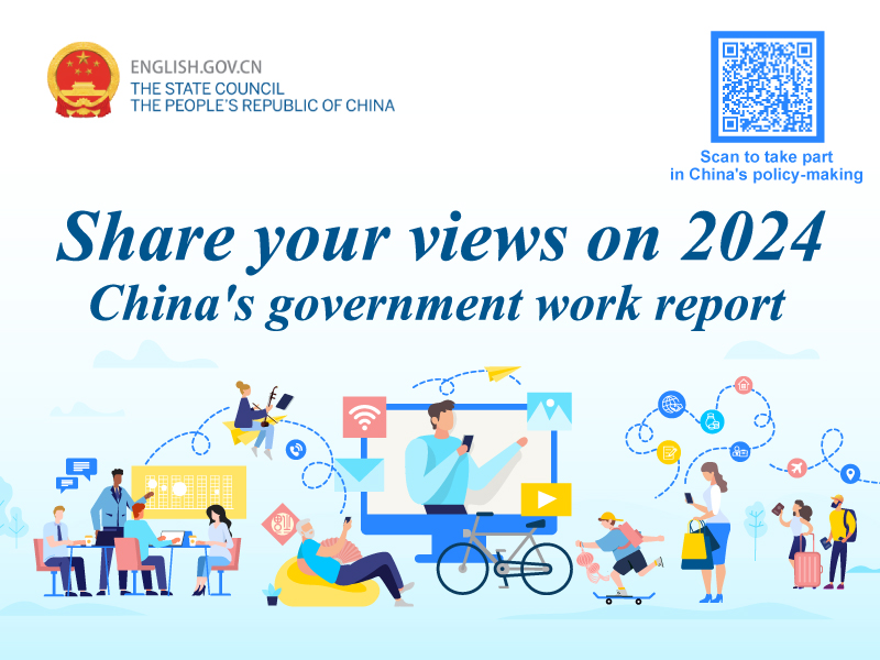 The Chinese government website launched an online initiative on Dec 14, 2023, to solicit public opinions and suggestions on government work. The online initiative, Share Your Views on 2024 China's Government Work Report, is also supported by people.com.cn, xinhuanet.com, chinadaily.com.cn, chinanews.com, and official websites of local governments and related departments. The initiative will run through to the annual sessions of the national legislature and the national political advisory body in 2024.